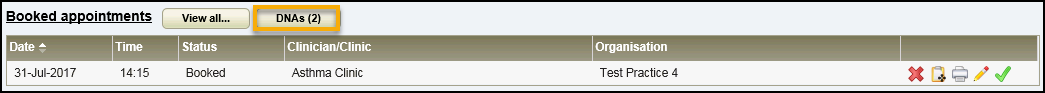 - In the Booked appointments section, select DNAs to list the patient's last 10 DNA's: