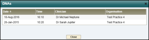 The DNAs view displays the most recent appointments that the patient did not attend.