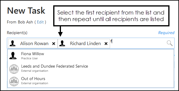 To send a task to more than one recipient, simply select the first recipient in To and then repeat until all the recipients are listed: