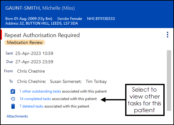 After selecting a task, if other tasks exist for the same patient, they display as outstanding, completed and deleted, select as required: