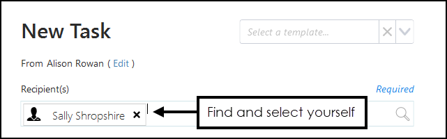 Tasks automatically opens, the New Task screen displays and the selected patient is attached. If required, select a template from the list available in Select a template: