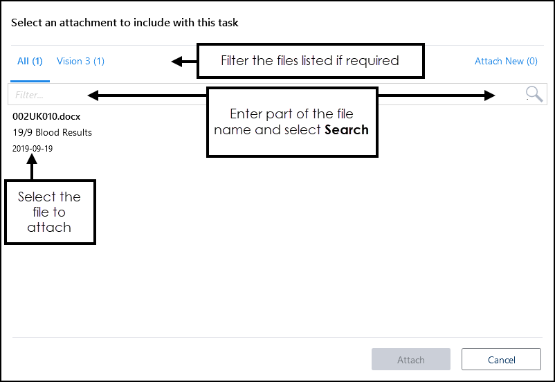 . - The Select an attachment to include with this task screen displays, all the files from the selected patient record display: