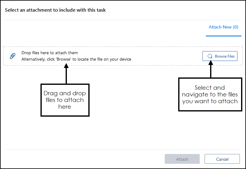 . - The Select an attachment to include with this task screen displays, drag and drop files onto the Drop files here banner, or select Browse Files to navigate to and select the file(s) to attach: