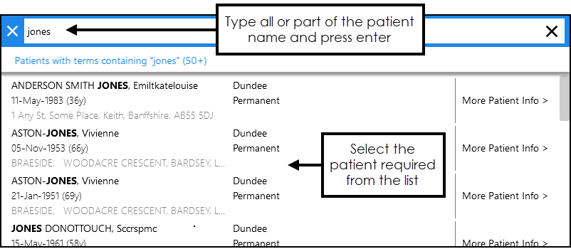 . A list of matching patients displays, select the patient required.Select More Patient Info