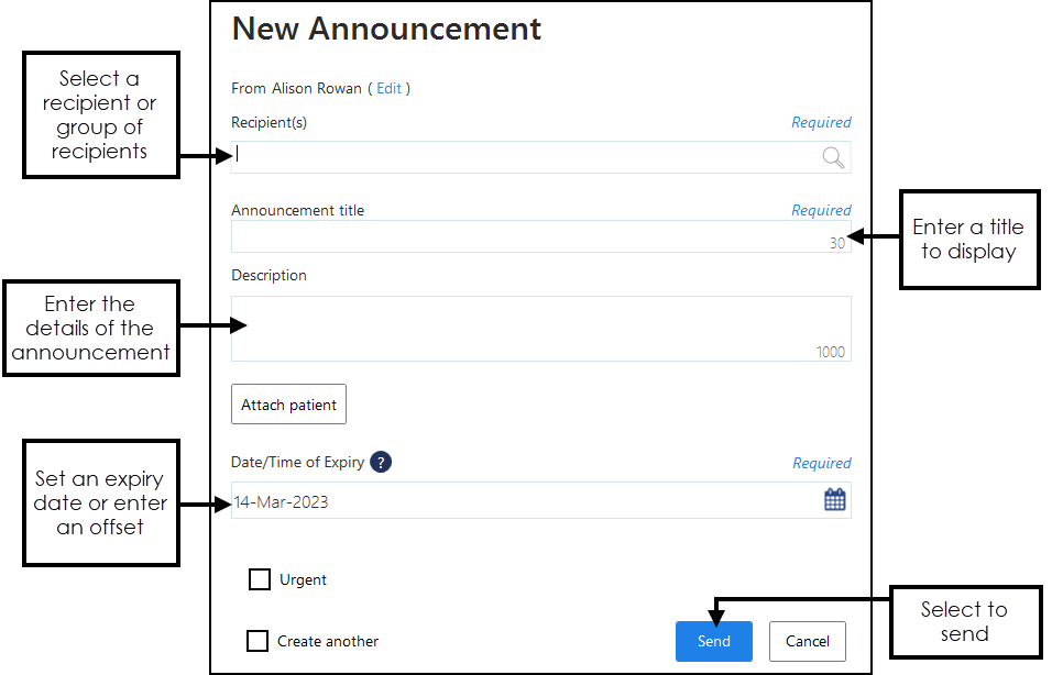 Important - When generating an announcement in relation to a deceased patient, remember to check you have attached the correct patient.Date/Time of Expiry - Defaults to today's date. If required, select a date that this announcement should expire, either select the Calendar
