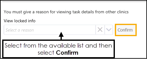 3. If the task is from a third party and has a patient from another practice attached, you must record a legitimate relationship with that patient. A message 'You must give a reason for viewing task details from other clinics' displays, select from the list available and then select Confirm: