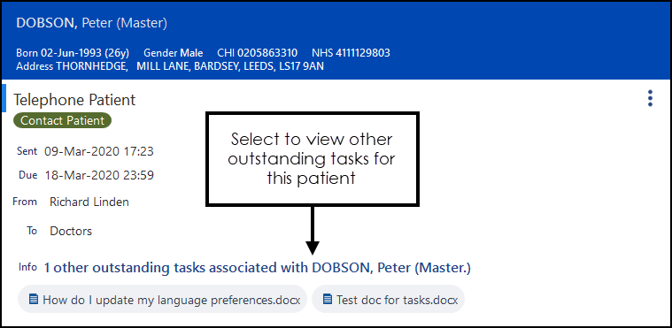 After selecting a task, if there are other outstanding tasks for the same patient, 'n other outstanding tasks associated with' displays where 'n' is the number of tasks. Select to list the other tasks: