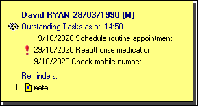 Providing you have Reminders enabled, if the selected patient has any outstanding tasks, they display on the yellow reminder:
