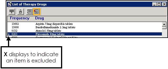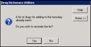 - A list of therapy items in order of frequency prescribed displays. If a list already exists, the 'A list of drugs for adding to the formulary already exists. Do you wish to recreate the list?' message displays, select Yes to recreate the formulary or No to retain your current formulary: