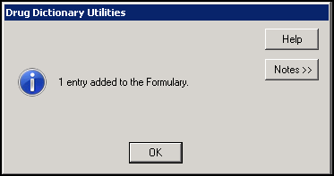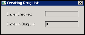 - The 'Create list of drugs for adding to the formulary. This will take many minutes.' message displays. Select OK to proceed and the Creating Drug List screen displays: