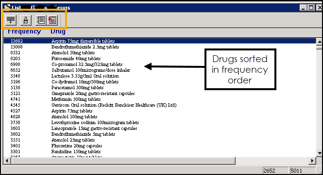 - On completion a list of drugs displays with their drug name, form and strength. The Frequency column includes the number of times each item has been issued, with the most frequent at the top: