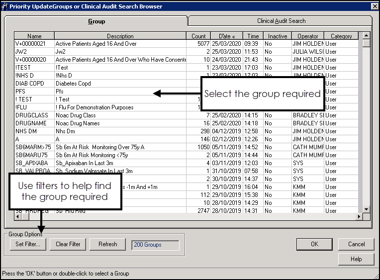 Group - These are created from Searches & Reports or Patient Groups, optionally, select a column heading to sort, or use the filters options to refine the list.
