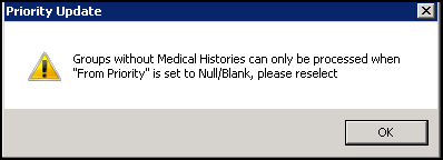- If your group does not have Medical Histories specified, an alert displays 'Groups without medical histories can only be processed when "From Priority" is set to Null/Blank, please reselect.':