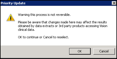 - A 'This process is not reversible. Please be aware that changes made here may affect the results obtained by data extracts or 3rd party products accessing Vision clinical data. OK to continue or Cancel to reselect.' warning message displays: