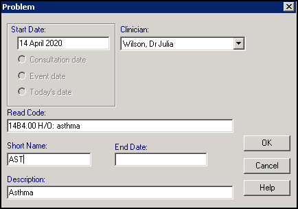 - Read Code - Enter the clinical term required, for example, #14B4 H/O Asthma.Note - We suggest avoiding QOF codes, as the problem may be treated as a new diagnosis.