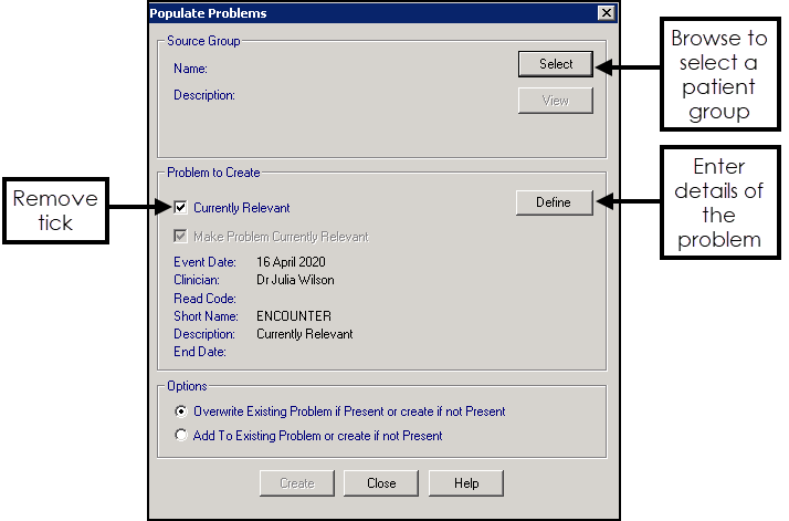 - Add To Existing Problem or create if not Present - To add extra data to an existing problem, use this option, for example, you might have patients who already have an Asthma problem and want to ensure Repeat Masters are included.