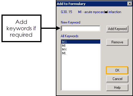 - Optionally add a keyword, these can make finding clinical terms easier. Enter a new keyword and select Add Keyword.Note - If the entry does not have any keywords, we recommend adding at least one keyword, otherwise it will be very difficult to find.
