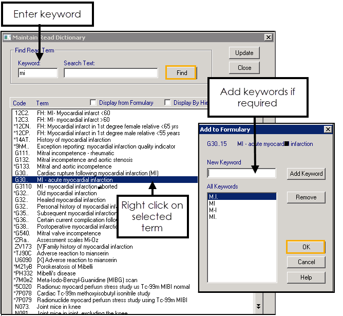 - Enter a Keyword or enter Read term details in the Search Text box, then select Find. For example, to add myocardial infarction to the formulary, enter a keyword of 'MI'.