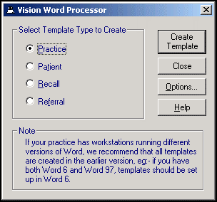 Select the template type required, either Practice, Patient, Recall or Referral.