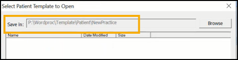 9. The Select [Template Type] Template to Open screen displays listing the templates in that specific template folder. For example, selecting a template type of Practice lists all templates in P:\WORDPROC\TEMPLATE\Practice.