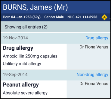The allergy details display in the Patient Summary: