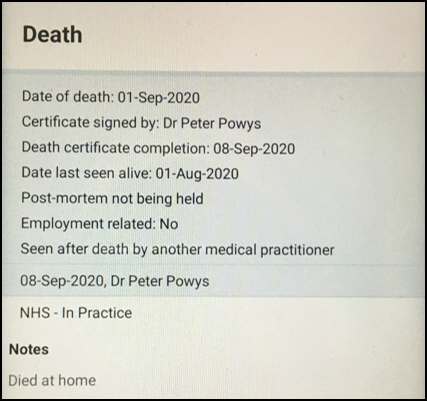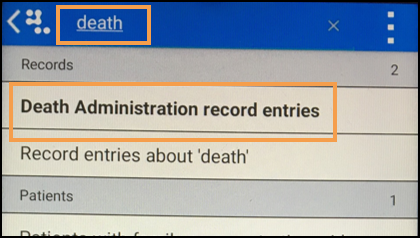 1. From the patient record, enter 'death' in to Search the patient record .