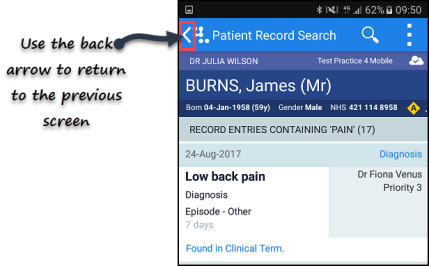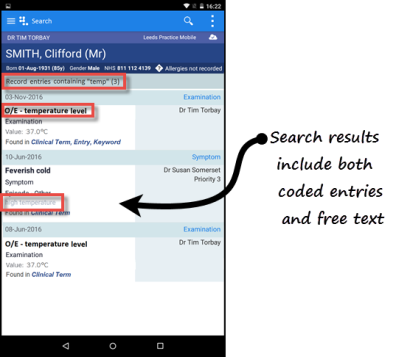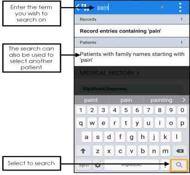 Vision Anywhere has the facility to search the patient's record, to quickly return specific information.