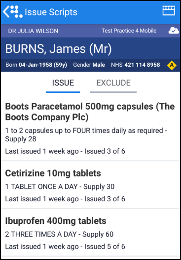 The Medication screen allows you to issue and reauthorise repeat medication. These are not printed, only issued.