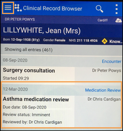 - Clinical Record Browser and scroll through the records returned to locate the Medication review required: