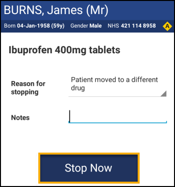 - Select the reason for stopping and enter any comments in Notes.