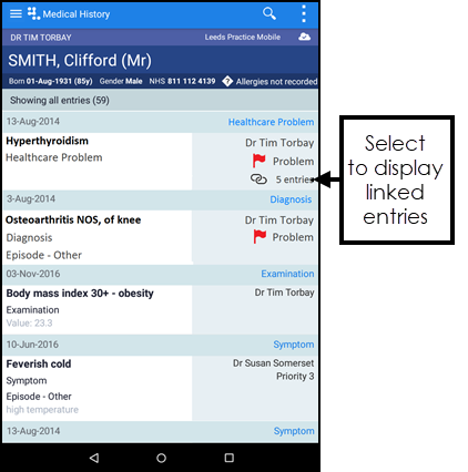 All problems are now shown as a header in the Medical History view, you instantly see if there are linked items and quickly view.