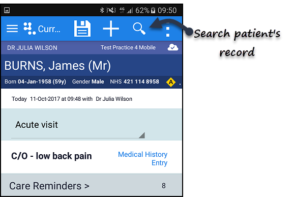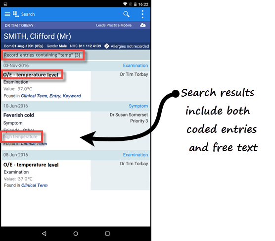 The search facility is now available when entering an encounter, allowing you to quickly search the patient's record for free text or coded entries.