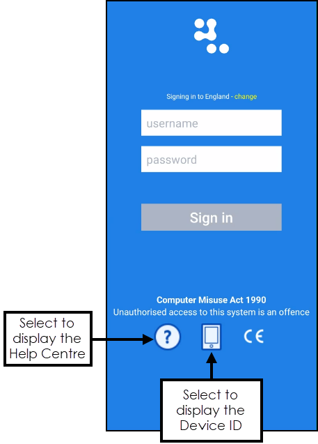app and the log in screen displays:Note - The first time you login you are prompted to select your country.