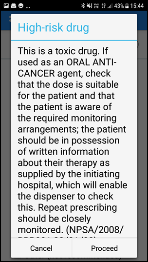 When a high risk drug, for example methotrexate, is selected a detailed toxicity warning displays, select Proceed to prescribe: