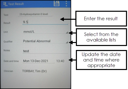 - Select the test you want to record, and the Test Result screen displays: