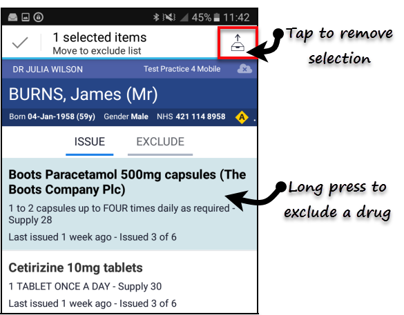 All the active repeats are automatically selected for issue. - Long press on any unwanted drugs to Exclude.