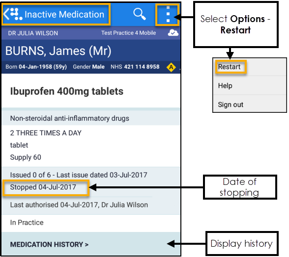 The medication now displays in the Inactive Medication screen and can be restarted by selecting Options