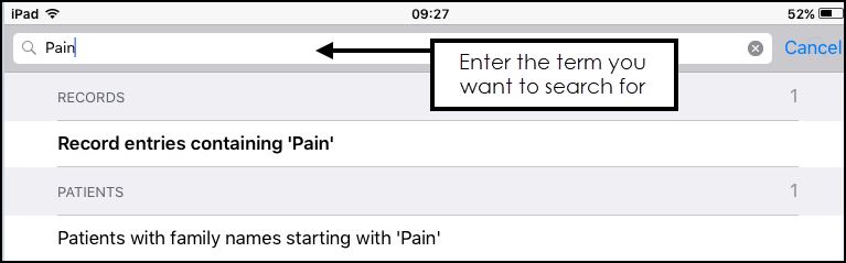 You can easily search a patient's record, enter the term you want to search for in Search: