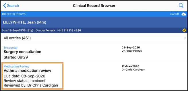 To view the details of a due or overdue Medication Review from the patient record either: