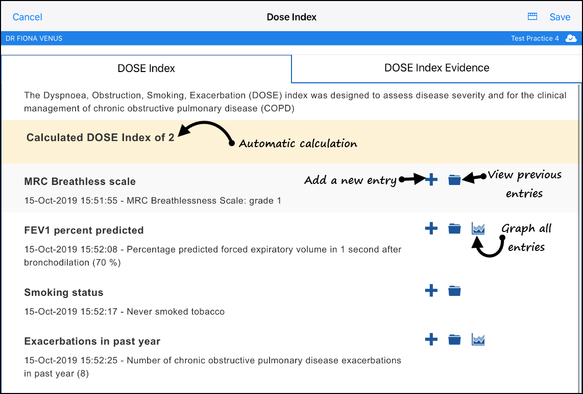 The Dyspnoea, Obstruction, Smoking, Exacerbation (DOSE) index is designed to assess disease severity and for the clinical management of chronic obstructive pulmonary disease (COPD)