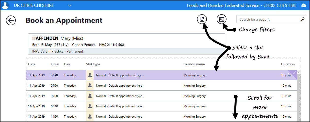3. Select Book an appointment for this patient, and the free slot search displays.