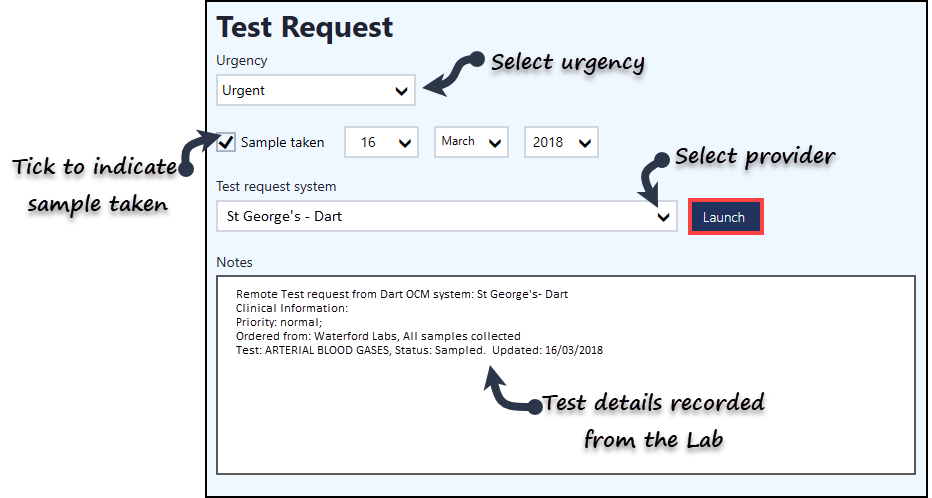 - The details of the test request automatically populates Notes.