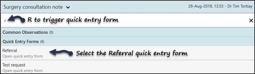 - Enter R or Referral, in the dynamic data entry bar to trigger the Referral quick entry form.
