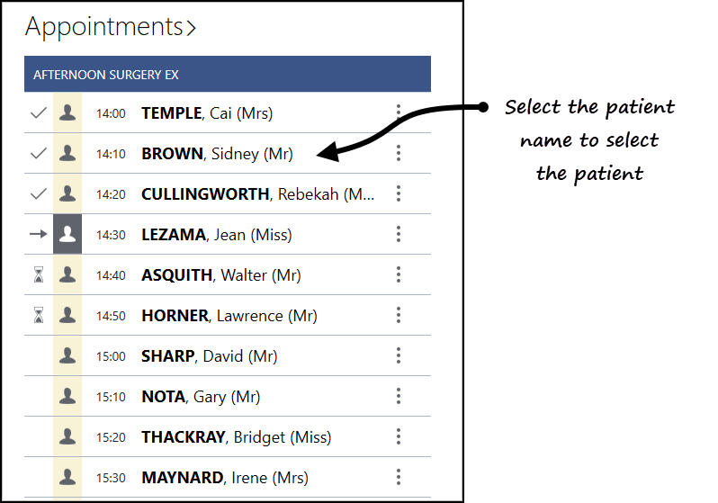 To select a patient from the list, select their name.