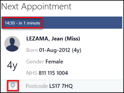 Your next appointment displays with the booked time and a count down, along with patient demographic information.
