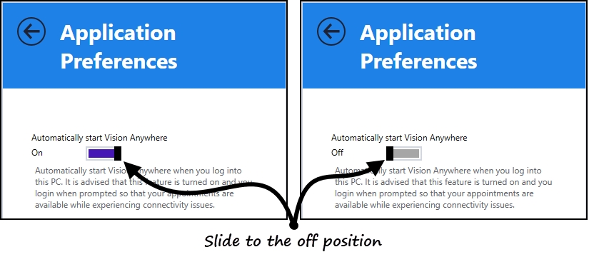 3. The Application preferences screen displays, using the slide bar, change Automatically start Vision Anywhere to Off: