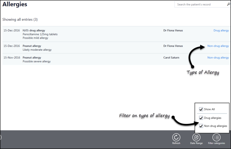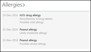 Allergies display in the Patient Summary view, and accessed by scrolling or swiping to the right.