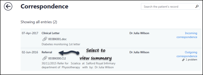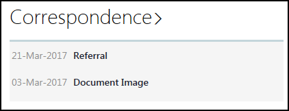 From Patient Summary, select Correspondence to display a summary of correspondence within the last 3 months.