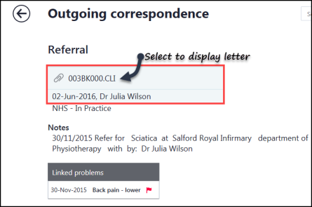 - Select the correspondence item and the summary displays, along with any linked problem, see Problem Linkage for details if required.