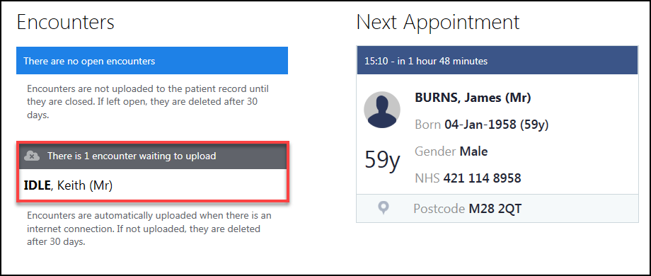 The Patient Summary screen also displays a message that the Encounter is waiting to upload.
